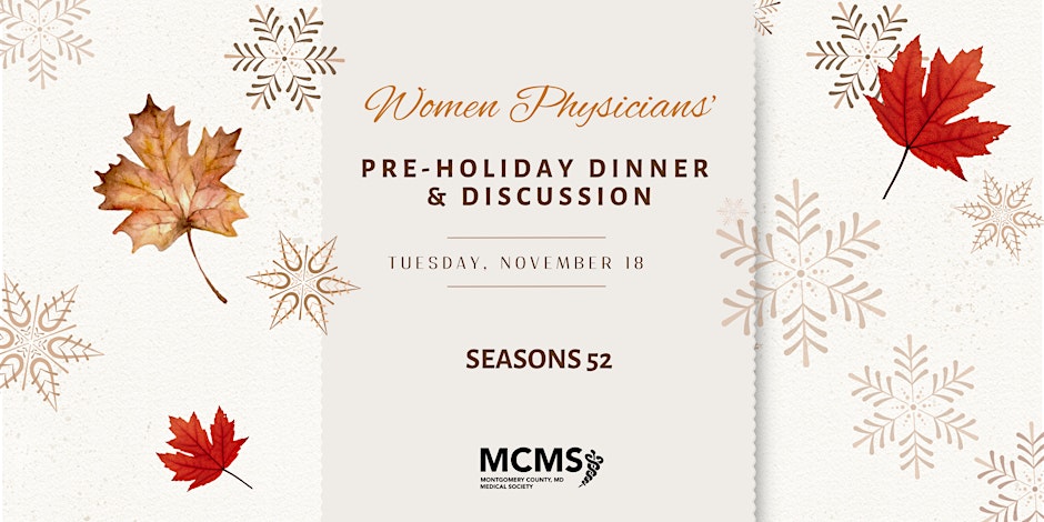 Women physician members of MCMS are welcome to attend this engaging event. A reception begins at 6pm followed by dinner and discussion at 6:30 pm. Table discussion facilitators will encourage discussion about ways to stay healthy during the holidays, funny holiday stories, and great holiday recipes.
