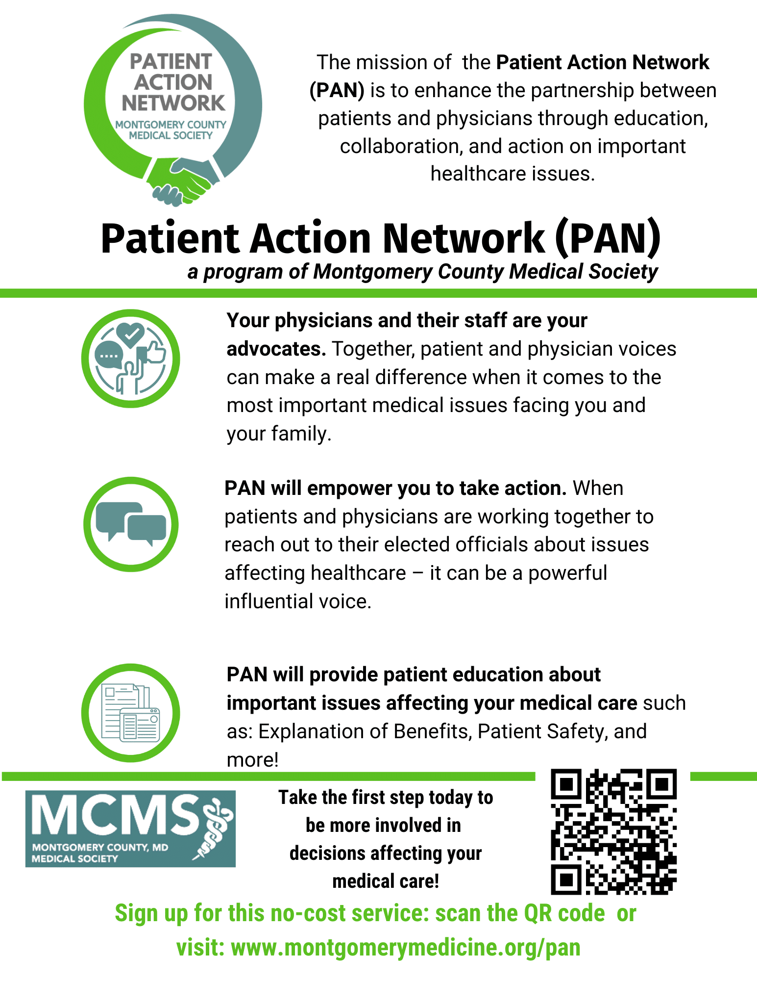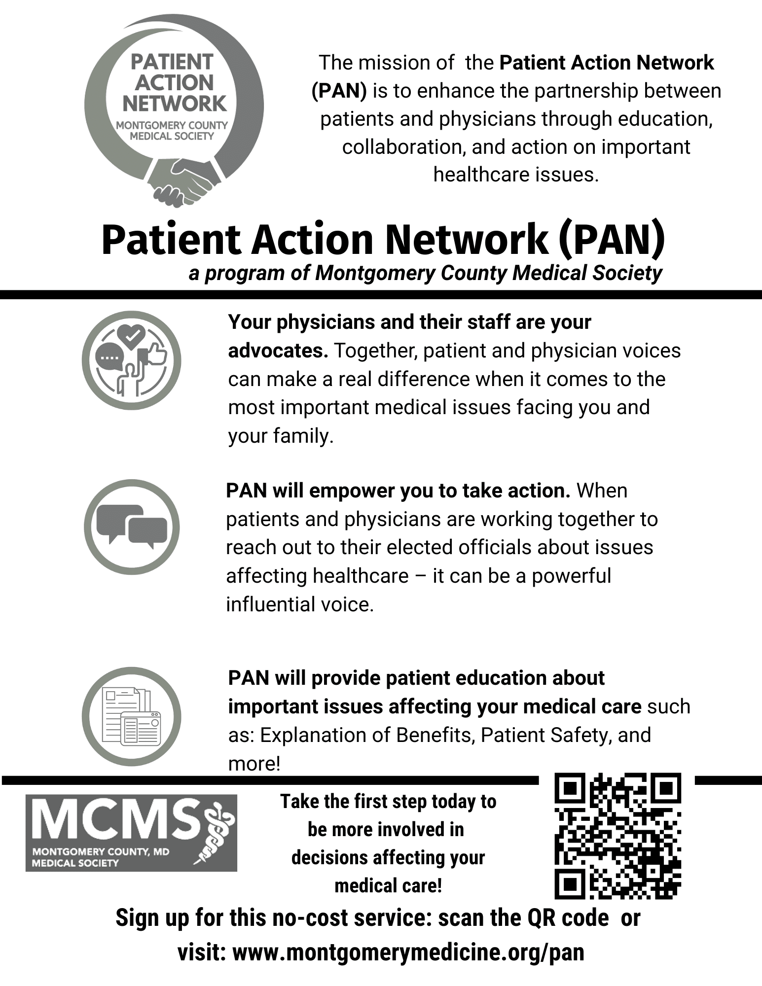 The Patient Action Network (PAN) of Montgomery County is a program of the Montgomery County Medical Society (MCMS). PAN's mission is to enhance the partnership between patients and physicians through education, collaboration, and action on important healthcare issues.